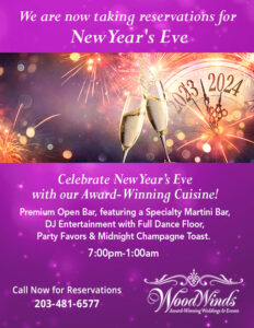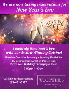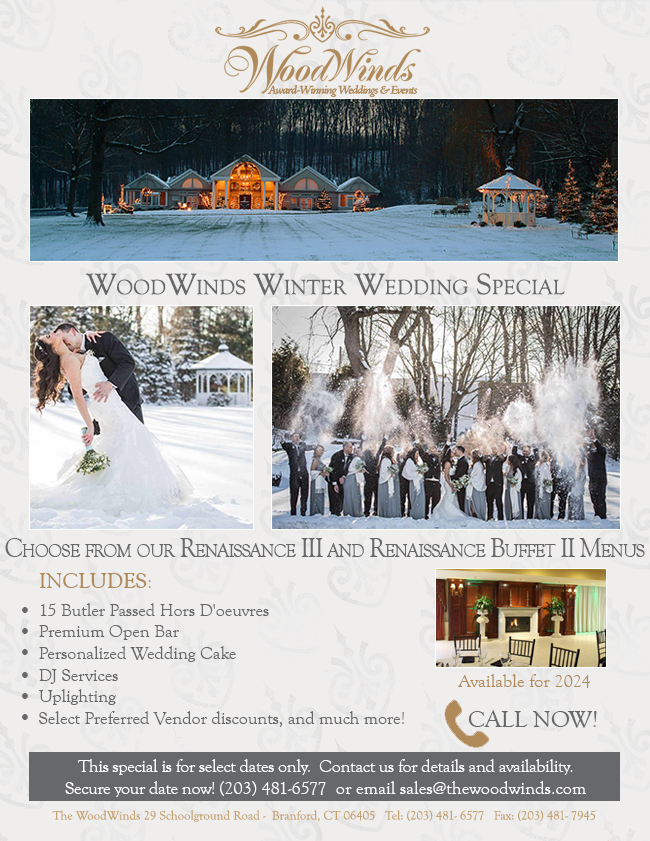 Woodwind’s Elegant, European Country Manor Setting in Branford, Connecticut is the recipient of numerous awards each year for their excellence in food and service. Whether you’re planning a wedding reception, corporate event or need a special banquet venue for private or holiday parties, you needn’t look any further! With beautiful landscaping and renowned cuisine, Woodwinds will make your wedding day or special event one to remember!